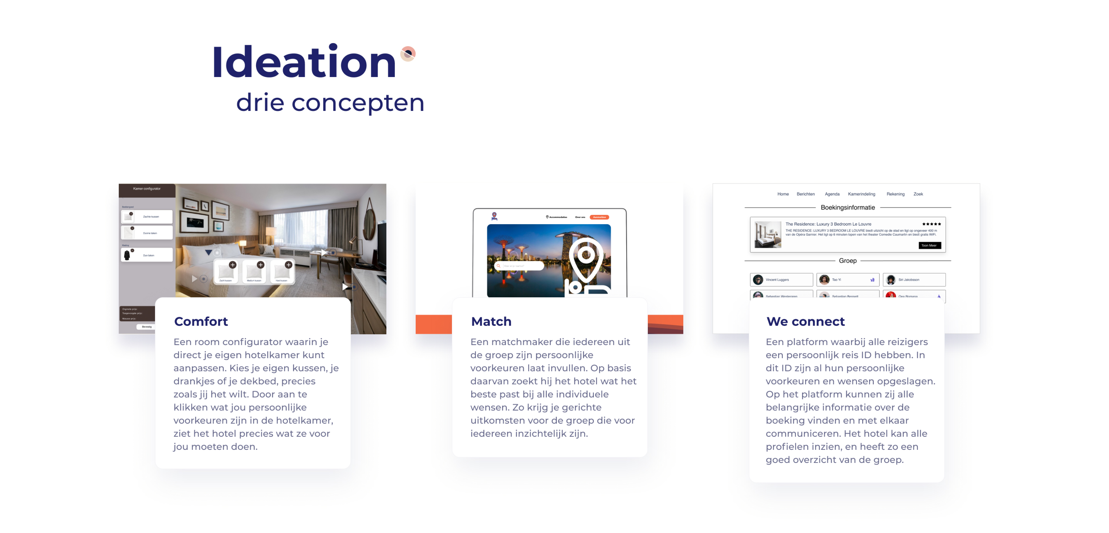 Na ons gedane onderzoek, zijn we gaan brainstormen om ideeën te genereren. Onze visie was daarbij het uitgangspunt. Na het filteren van alle ideeën, bleven er drie concepten over die we verder hebben uitgewerkt. Bij alle concepten ligt de nadruk op de persoonlijke wensen en voorkeuren van de hotelgast. Ons uiteindelijke concept werd een