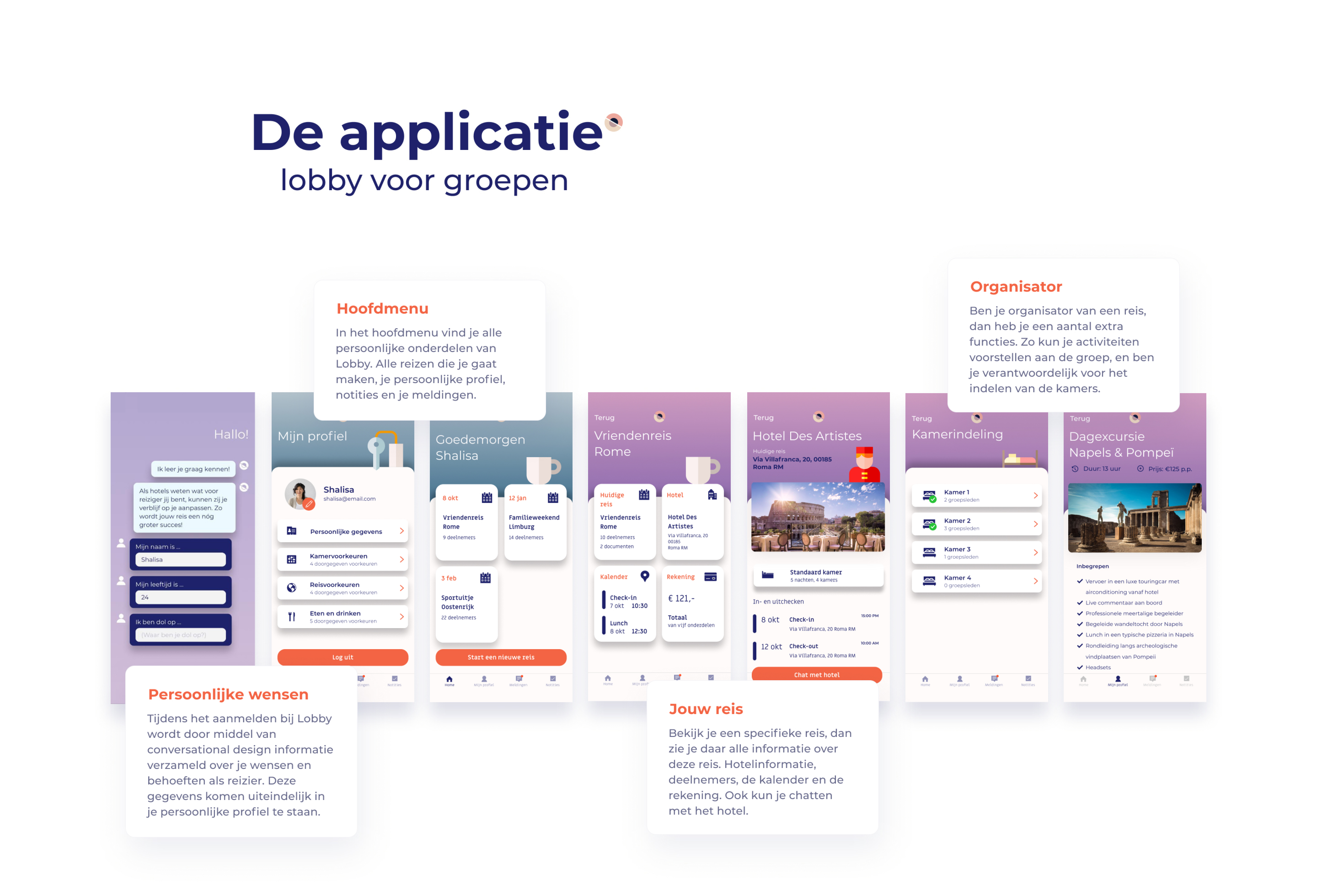 Lobby voor hotels is een desktop applicatie waar hotels hun groepsboekingen kunnen beheren en gedetailleerd inzien. Op basis hiervan kunnen zij gepersonaliseerde service bieden. Er is onderscheid gemaakt tussen services die het hotel biedt en externe services die zij kunnen aanbieden in samenwerking met andere partners.